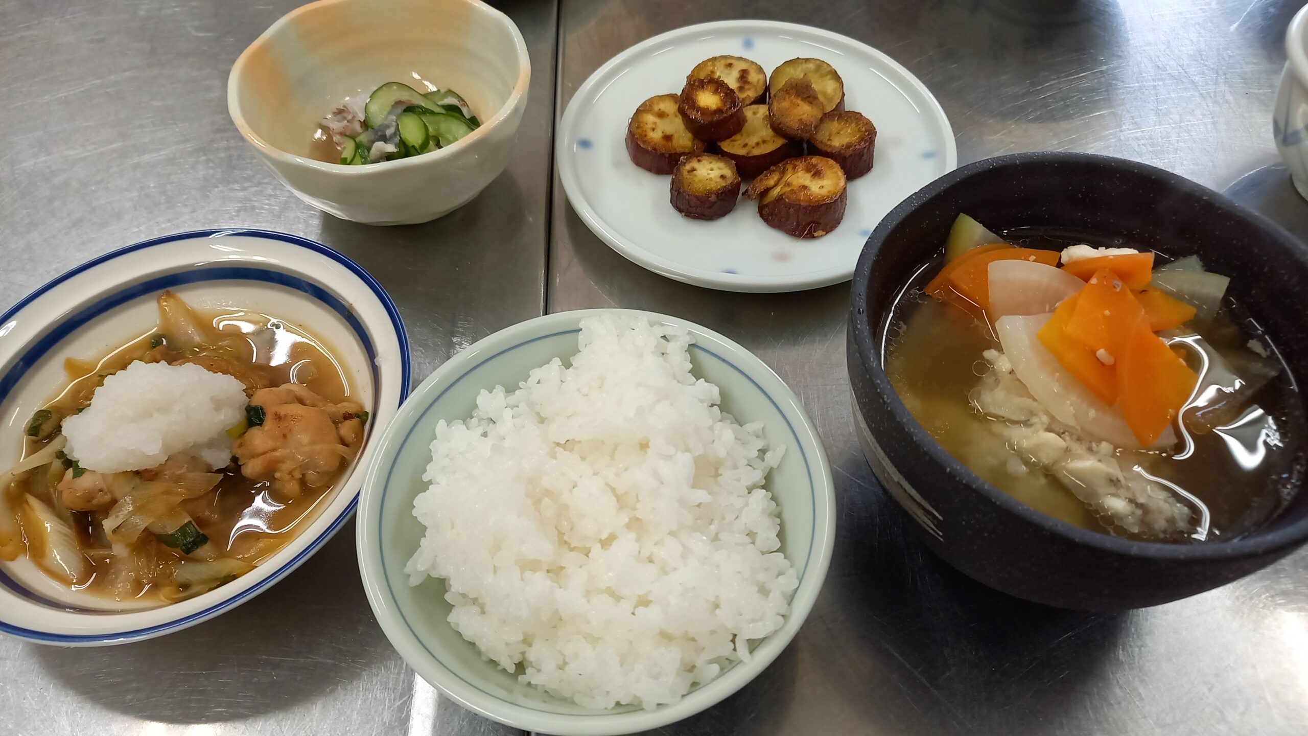他にも鶏ねぎ炒め、さつま芋のバター風味、きゅうりの酢の物を、それぞれが出来る事をしながら賑やかに取り組みました。さつま芋のバター風味は焼く前にレンジで予め熱を通して、フライパンで焼く時間を短縮することを三宅講師はポイントを抑えて分かりやすく解説してくれました。