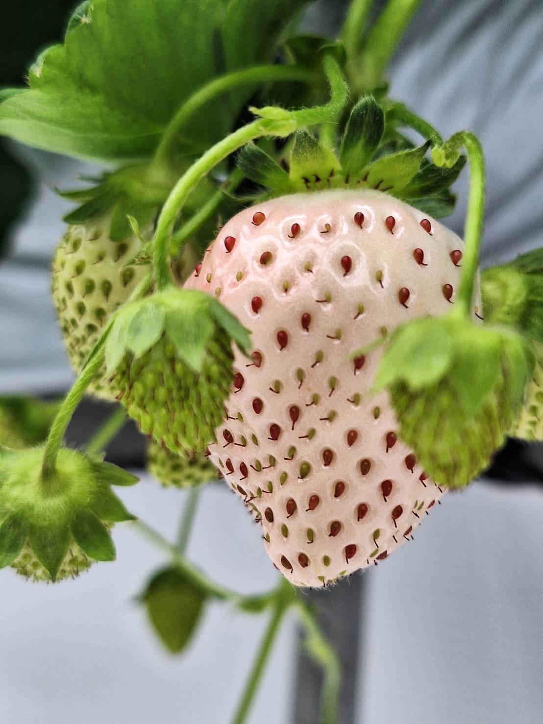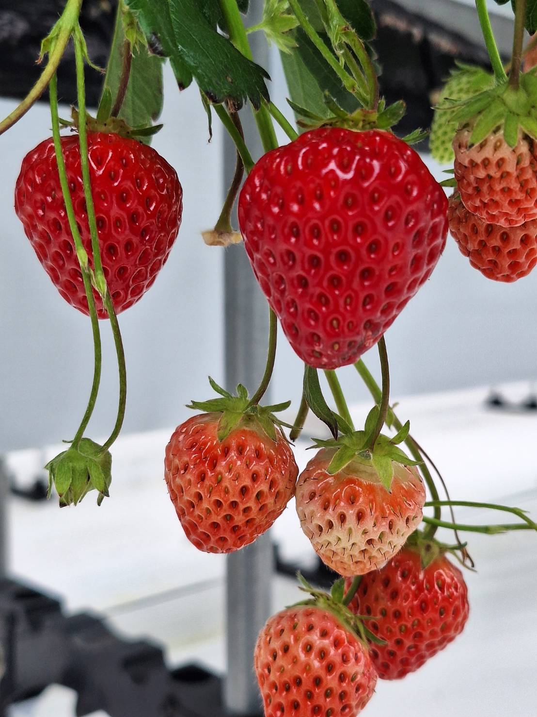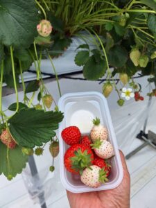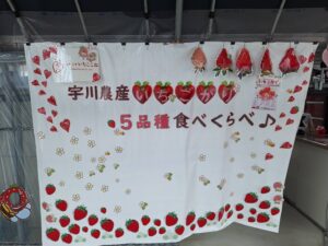さぁて、いよいよイチゴの食べ放題が始まりました。品種は、あき姫、やよい姫、恋みのり、紅ほっぺ、パールホワイトの5種類です。食べ放題の制限時間は30分!!