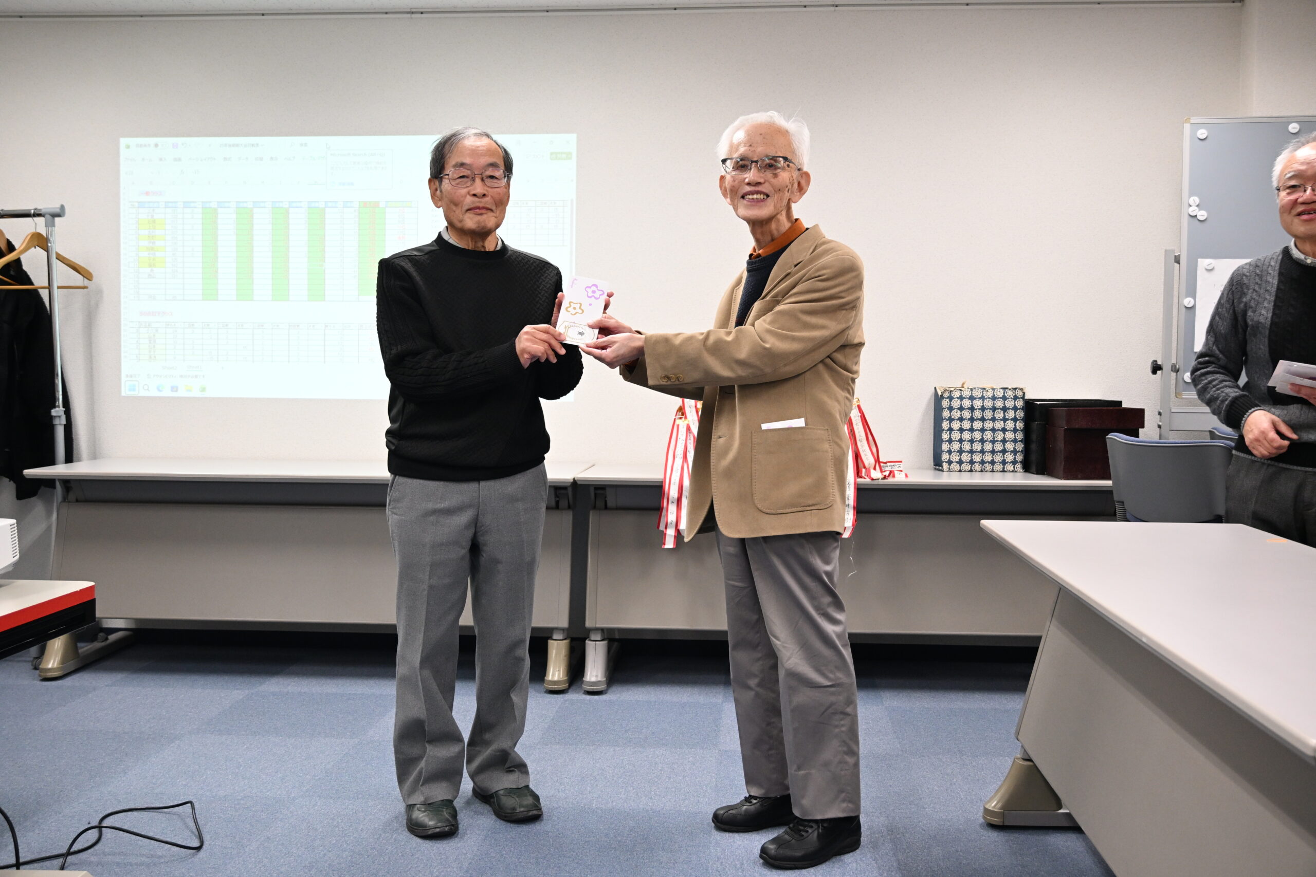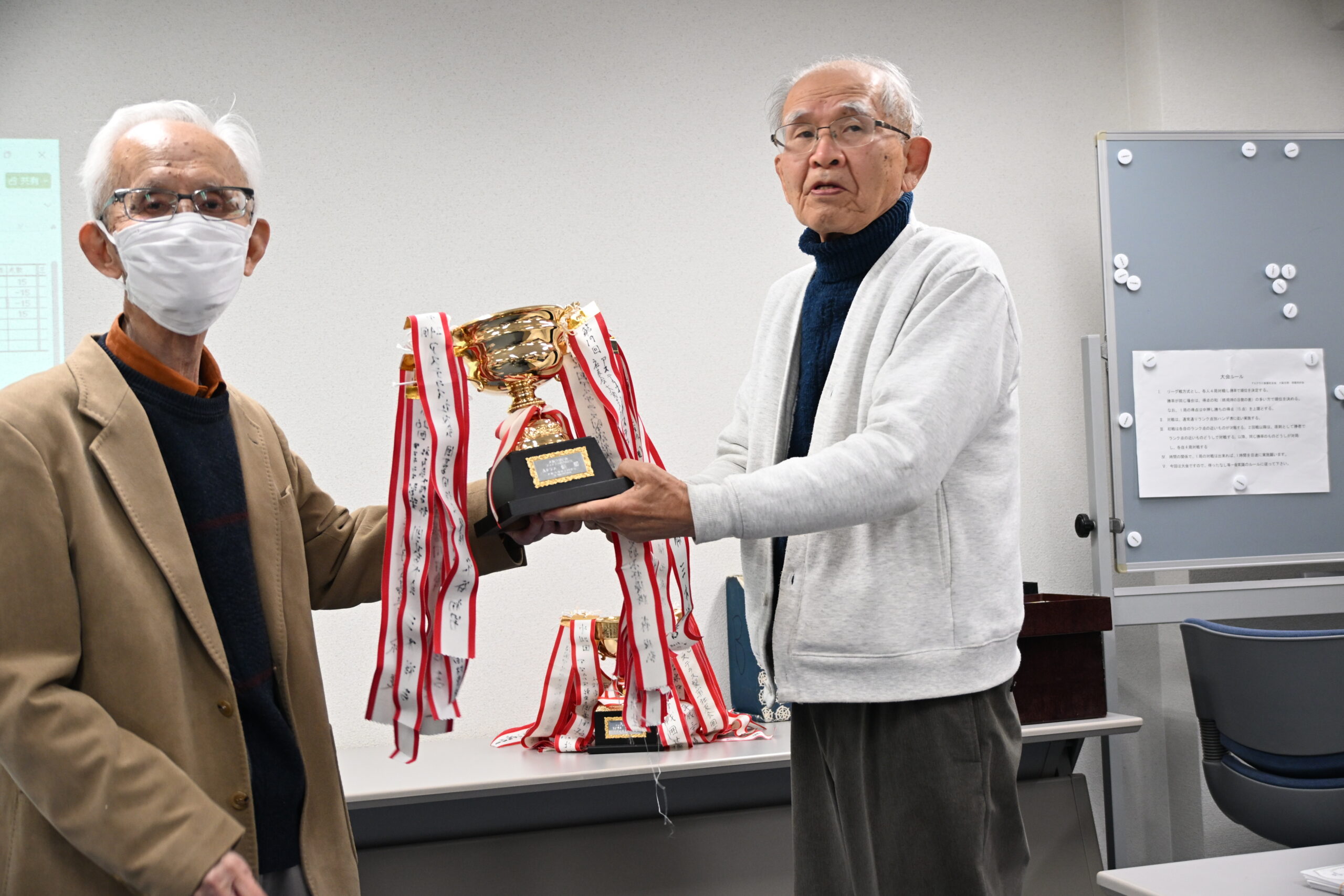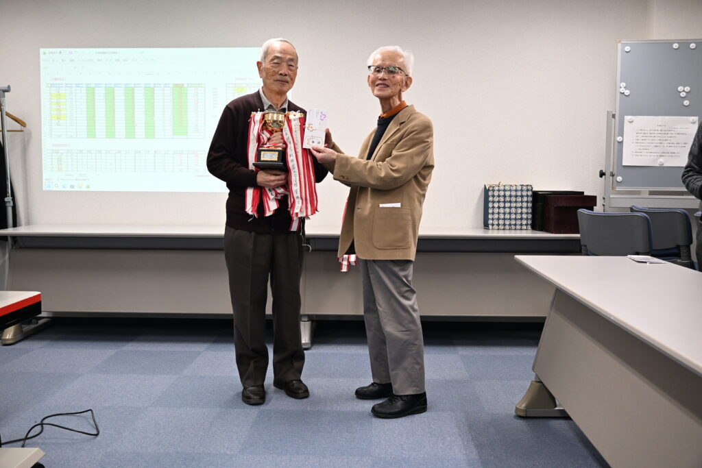 大会では、和気相合いとしたなか、知力・気力・体力・(棋力)を振り絞って各人4回戦を戦い抜き、一般クラスの優勝者は三木さん、2位十倉さん、3位石橋さん、初級クラスでは3人が同じ勝率でしたが、上位の小久保さんが優勝、2位は山本さんでした。おめでとうございます。表彰式では、会長の福島さんから各クラス優勝者にはトロフィー、各々賞品を授与されました。
