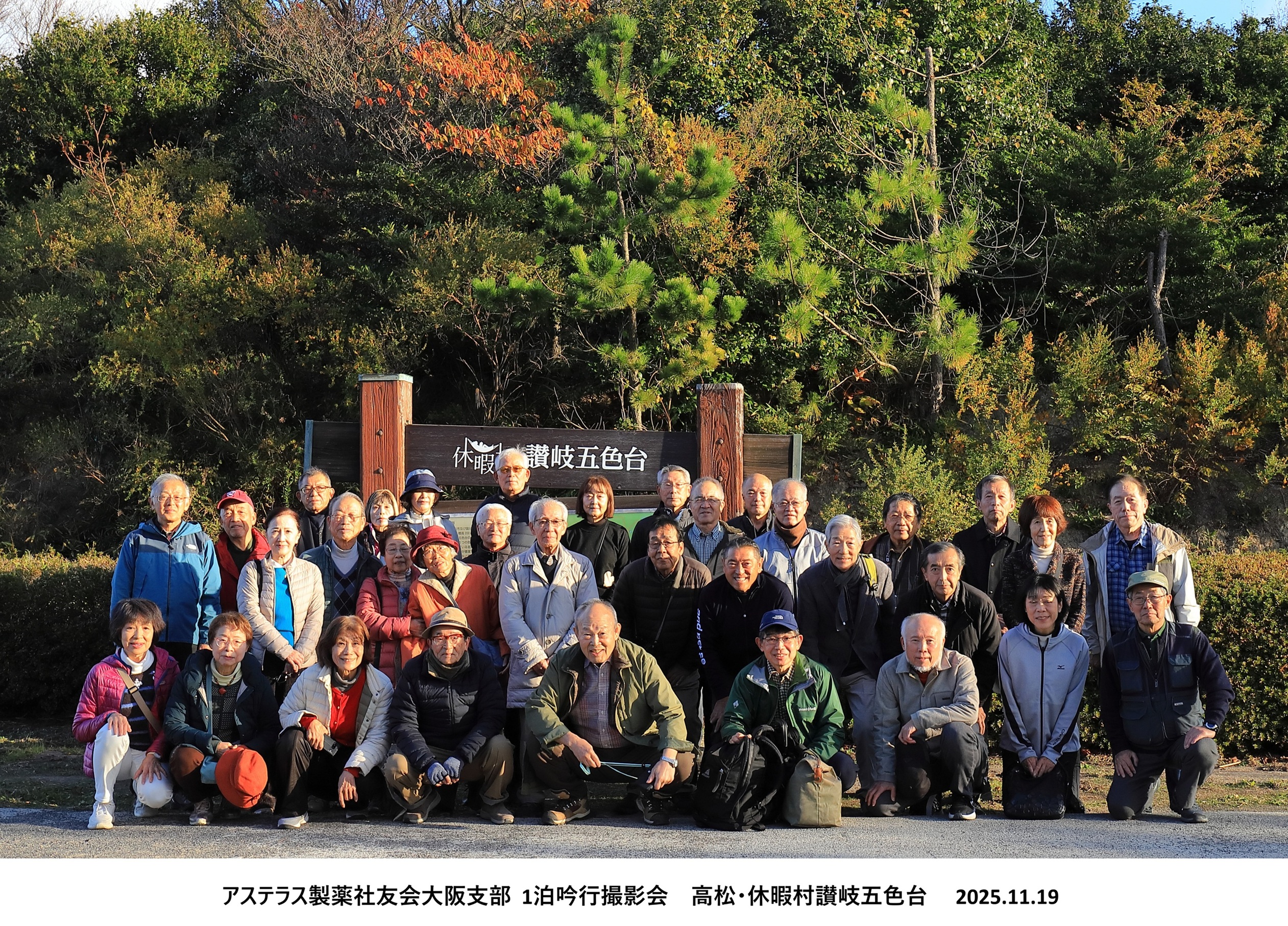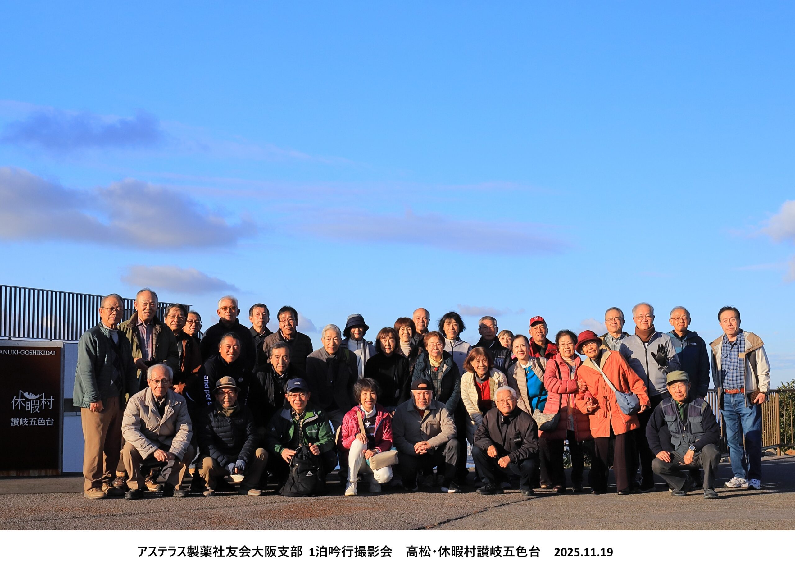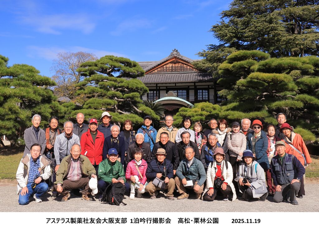 11月18日(火)、19日(水)に俳句同好会との共催で宿泊吟行・撮影会を行いました。大阪を出て瀬戸大橋を渡り五色台に宿泊し、大鳴門橋・明石海峡大橋を渡って戻ってくるという岡山と香川を巡る貸切バス旅行でした。参加者は写真同好会17名(内2名は俳句にも所属)、俳句同好会8名、ゲスト9名の合計34名でした。