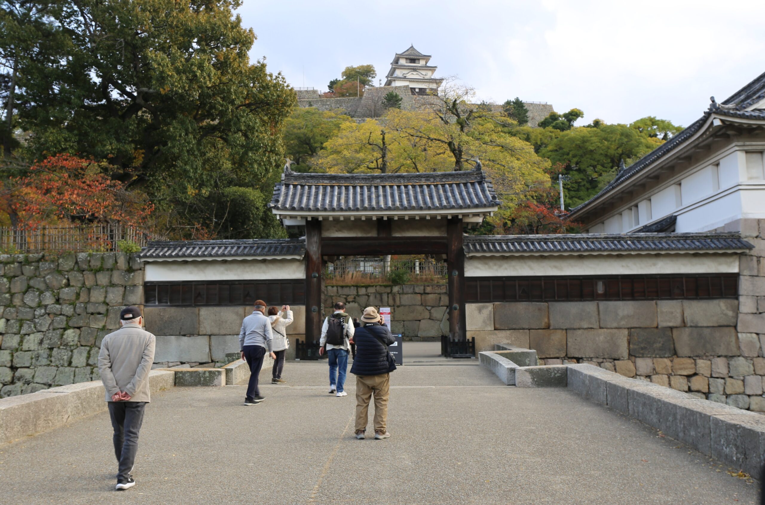 一日目は朝8時に大阪駅前を出発し、岡山県瀬戸市にある牛窓神社に向かいました。牛窓神社は海を望む高台にあり、紅葉を撮影した後は364段もあるという長い石段を下りました。昼食後、瀬戸大橋を一望できる鷲羽山展望台に行き、雄大な風景を撮影しました。その瀬戸大橋を渡り、石垣の名城として知られる丸亀城を訪れ、そびえ立つ天守にレンズを向けました。宿泊した「休暇村 讃岐五色台」には空が映り込む水鏡があり、思わず何枚もシャッターを切りました。
