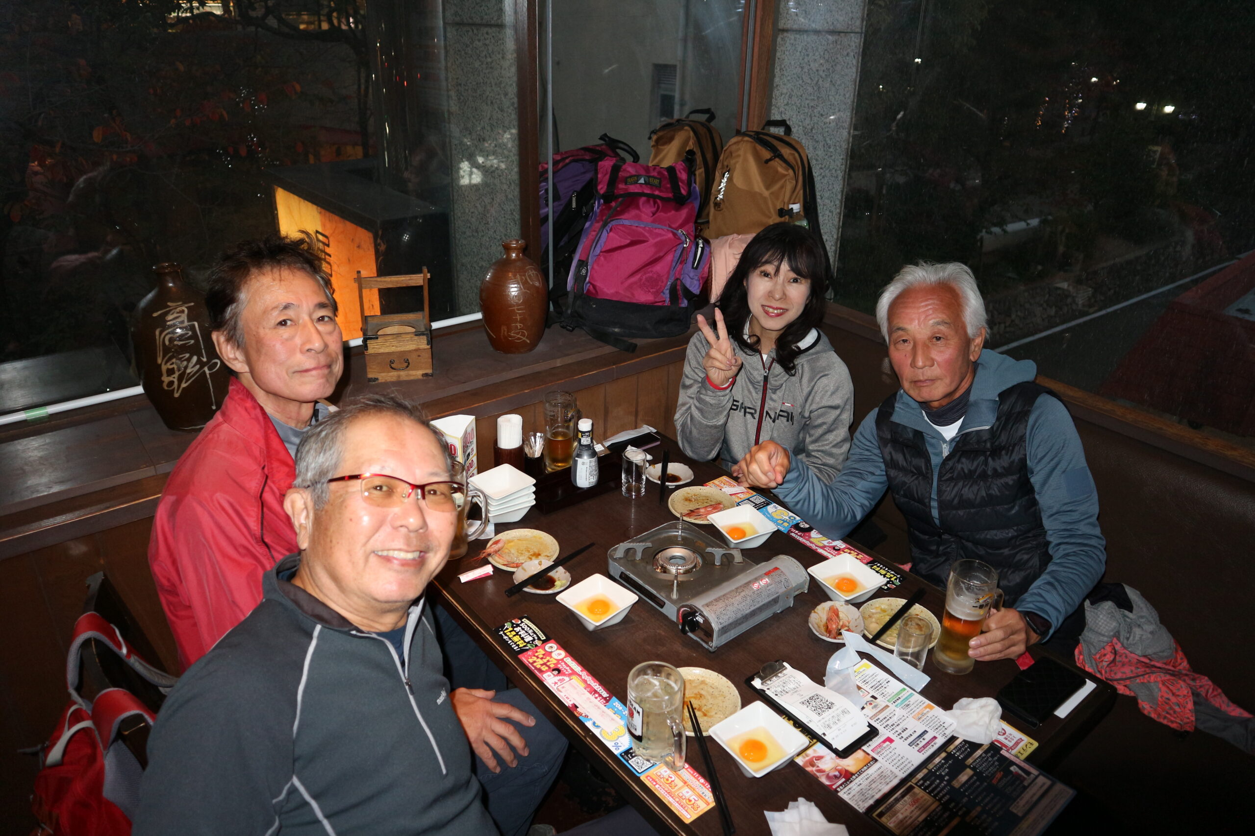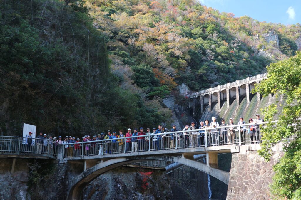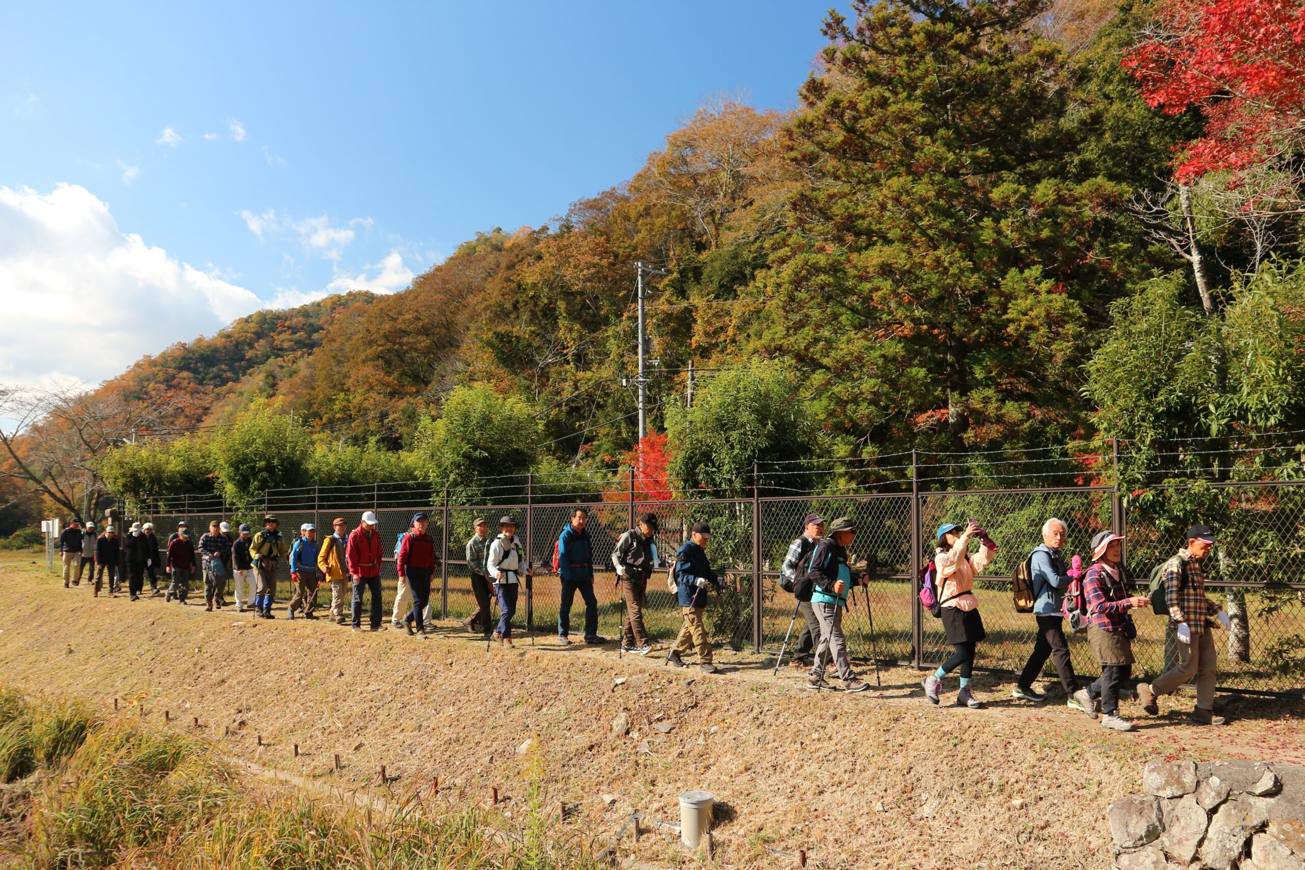 JR宝塚線の道場駅に朝10時に集合し、爽やかな秋の日差しを浴びながら準備体操を行った後、千苅ダムまで平坦な道を歩きました。千苅ダムは時として豪快な放水を楽しめる景勝地ですが、今回は晴天続きのせいか放水されていませんでした。千苅ダムを出ると本格的な登山が始まり、標高が上がるにつれ周りの山々の紅葉を楽しめるようになりました。大岩岳山頂への最後の急な坂を登りきると一気に視界が開け、眼下には千苅貯水池、眼前にはどこまでも連なる紅葉に彩られた山々が広がり、どこか別世界に来たような感覚に囚われました。絶景を眺めながら昼食をとった後、風吹岩に向かいました。渡渉や落ち葉で滑りやすい箇所がありましたが全員無事に下山し、16時前に道場駅から予定していた電車に乗ることができました。歩行距離は約10kmでした。JRで宝塚駅まで移動し、「白木屋 宝塚花の道店」にて懇親会を行いました。山歩き参加者は44名、懇親会参加者は41名でした。