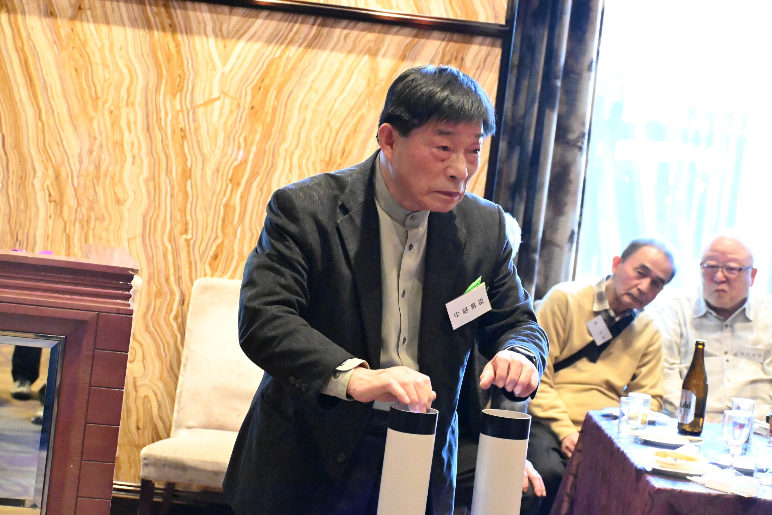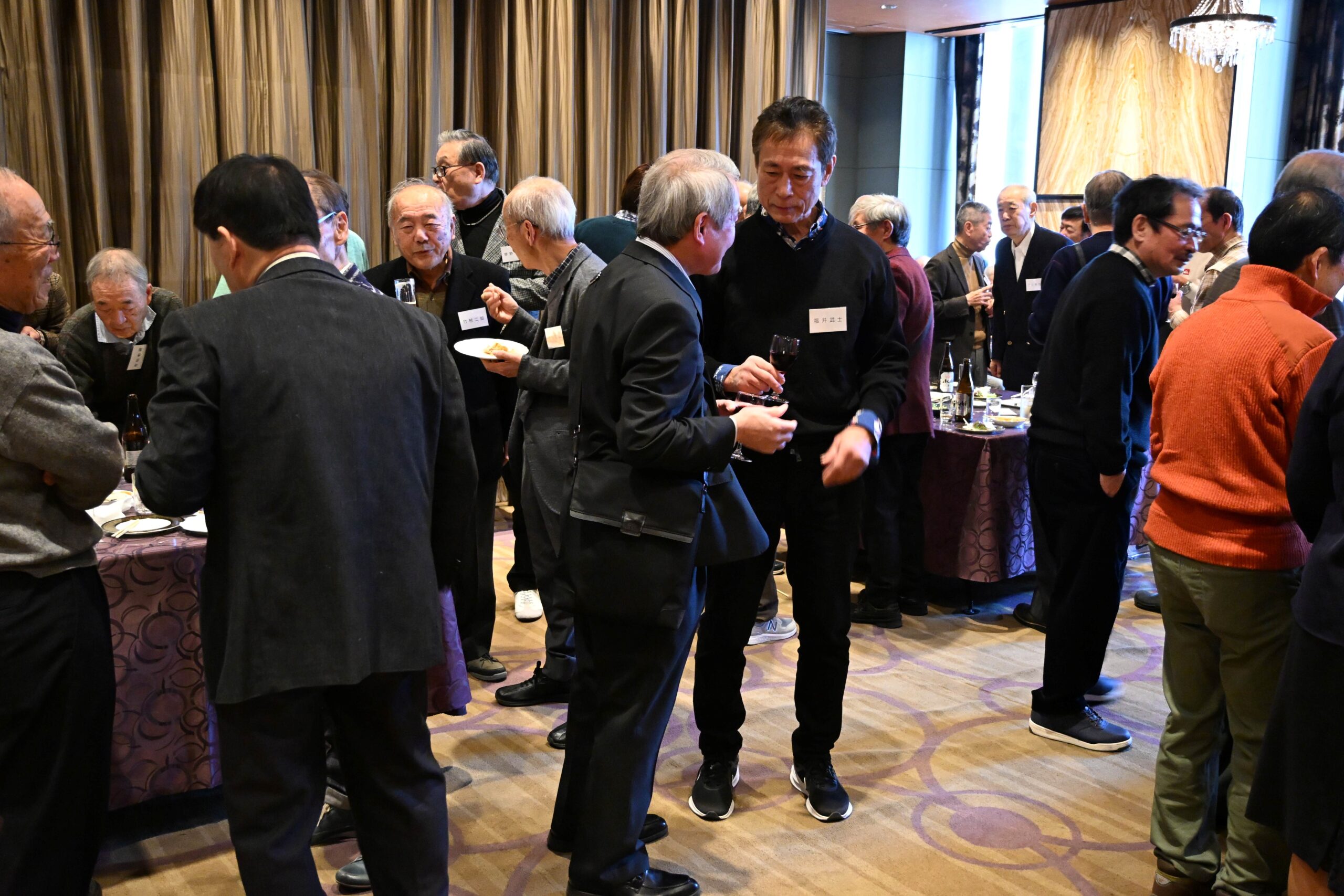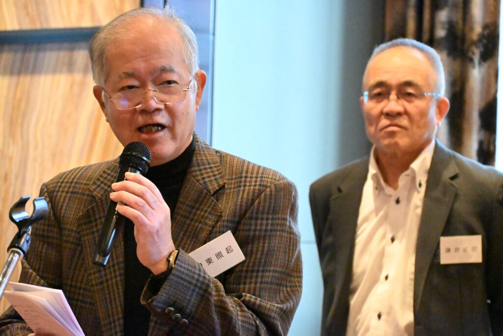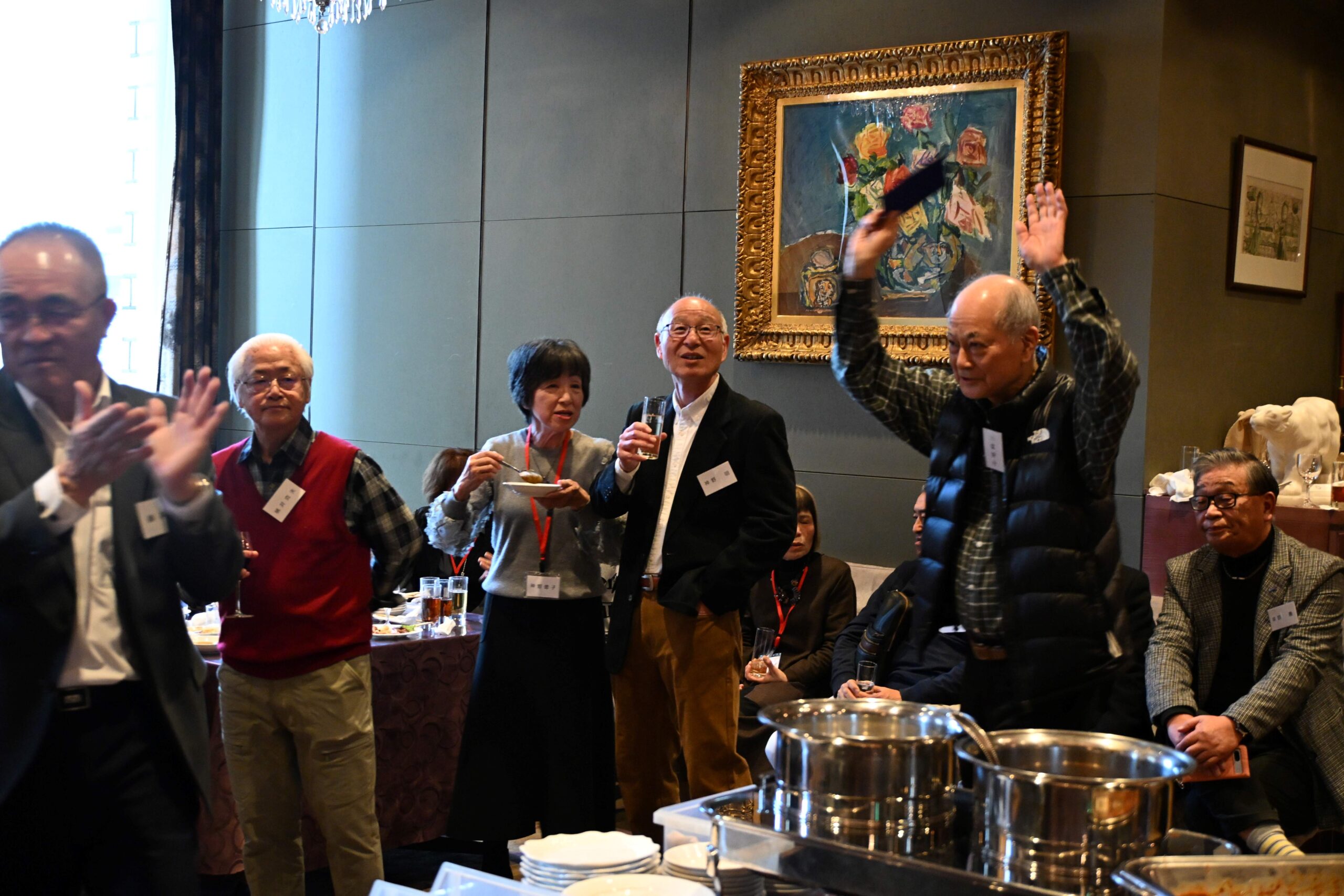 今年は、参加者が135名と昨年をやや下回ったものの、会場のスペースの関係で昨年と同様の立食パーティー形式となりました。昨年は、多数の参加者が出された料理を確保しようとして足りなくなりましたが、今年は節度ある飲食を呼びかけ、参加者の皆様のご理解を得て、問題なく終えることができました。会場のあちこちで久しぶりの友人との語らいや笑顔での握手などが見られ、いつものように和やかな時間が流れてゆきました。おなじみになったマジック披露では常に新たなトリックで目を楽しませていただき、景品抽選会で会場全体が大いに盛り上がりました。楽しい時間はあっという間に過ぎて、午後二時に世話人の白橋さんの中締めによってまた来年の再会を誓って散会となりました。その後、名残を惜しんで二次会へとなだれ込む姿も多く見られました。