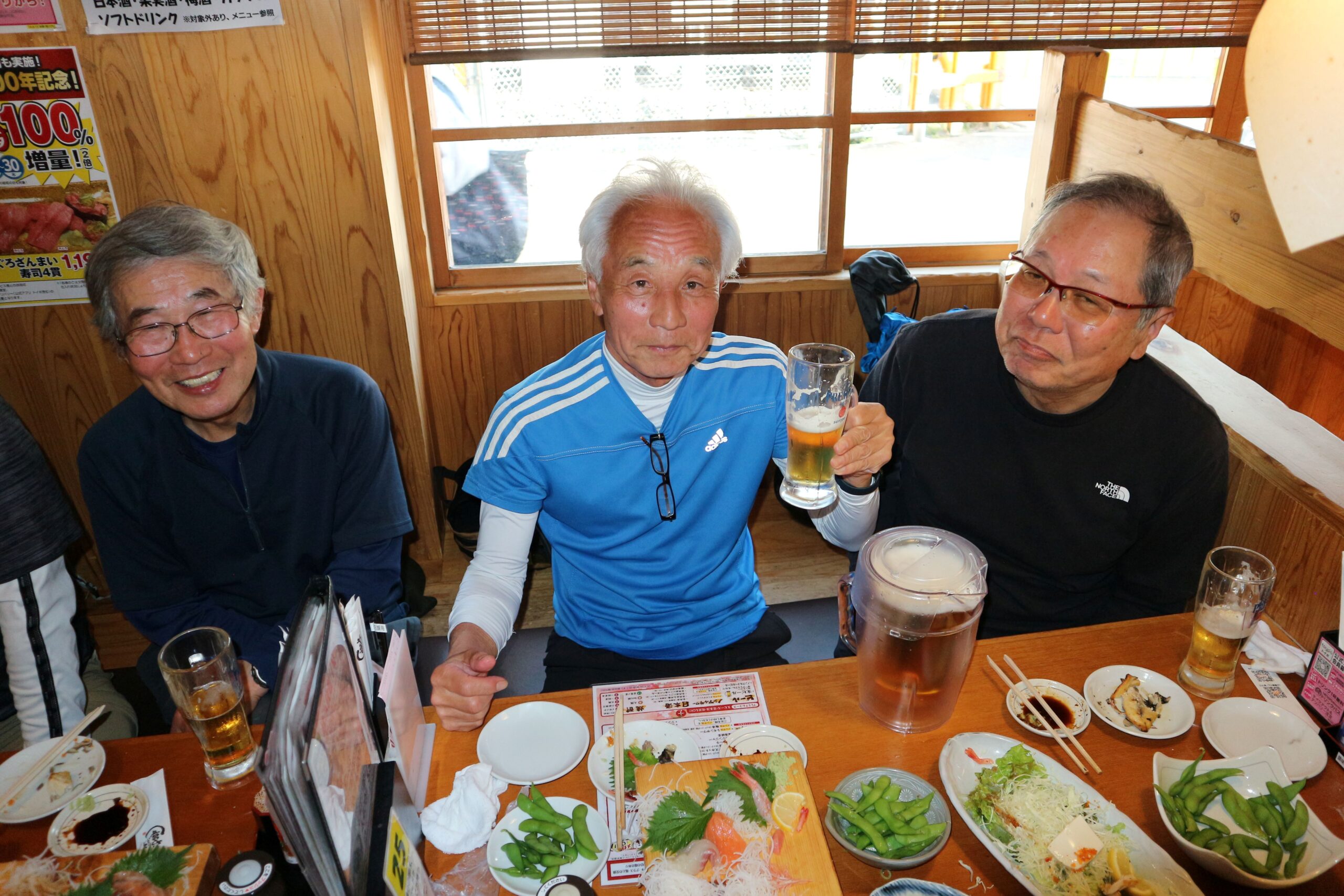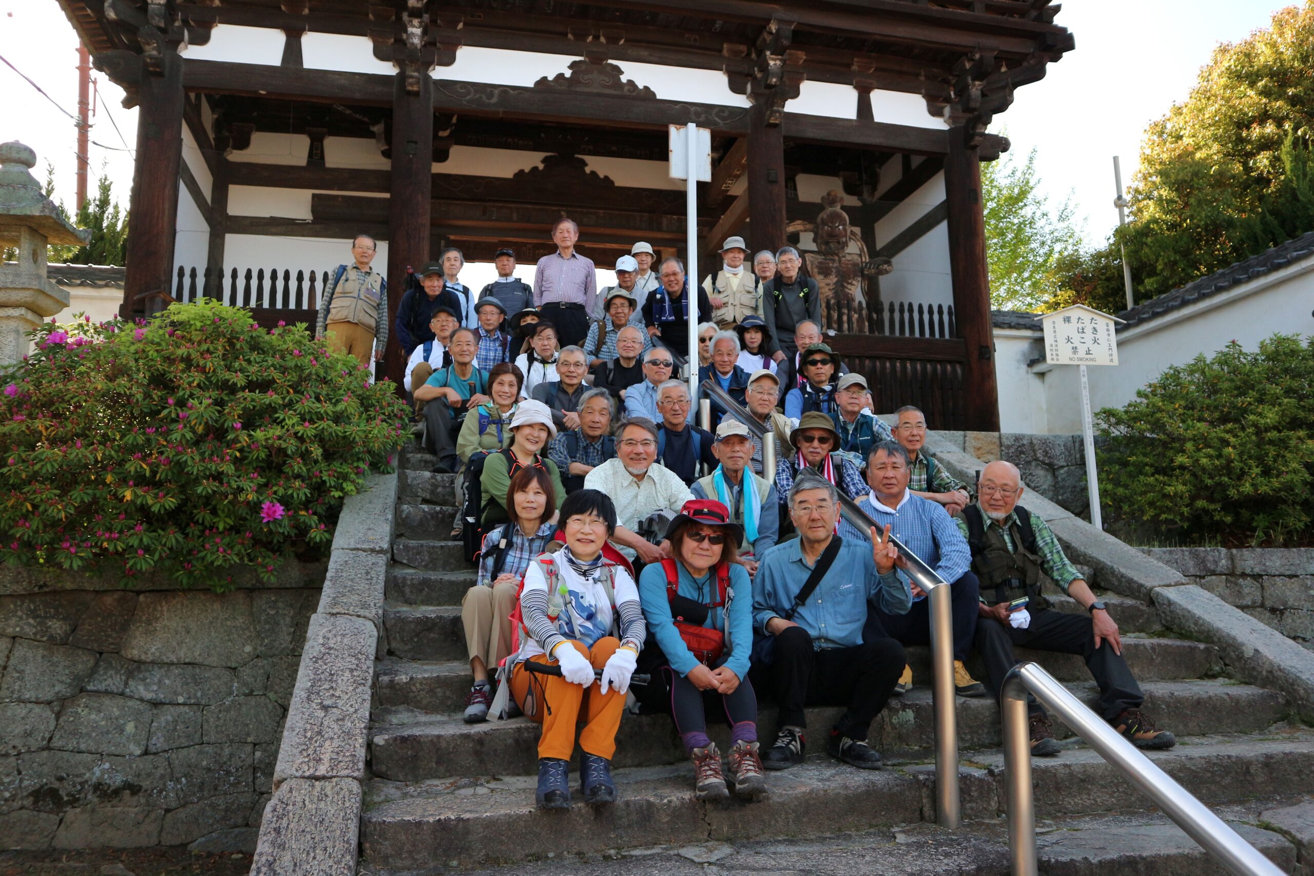昼食後は新緑に包まれた祐泉寺を経て、八重桜や牡丹が見頃を迎えた當麻寺に下山しました。古くは万葉集にも詠まれ、古代史の舞台ともなった歴史を感じられるコースでした。登りが結構きつく、濡れた岩や落ち葉で滑りやすい箇所がありましたが全員無事に下山し、16時前に当麻寺駅から電車に乗ることができました。近鉄南大阪線で藤井寺駅まで移動し、「や台ずし 藤井寺駅前町」にて懇親会を行いました。歩行距離は約8 kmでした。山歩き参加者は42名、懇親会参加者は40名でした。
