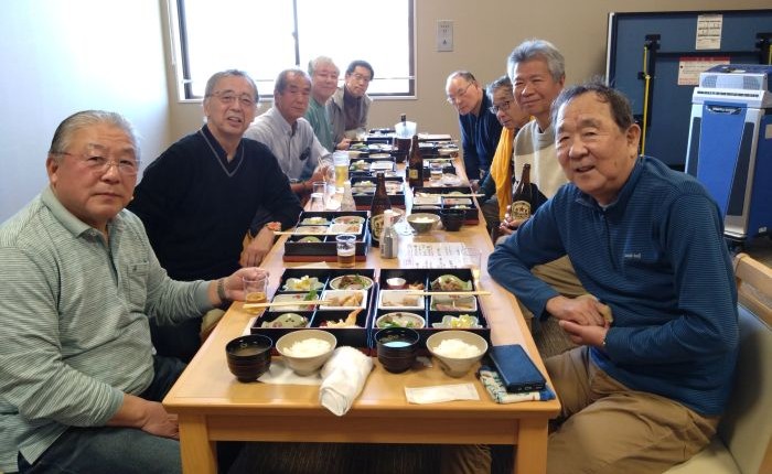 そして、12時からの昼食に合わせて各自、温泉で汗を流した後、宴会場に集り、食事とビール等を飲みながら話に花を咲かせました。