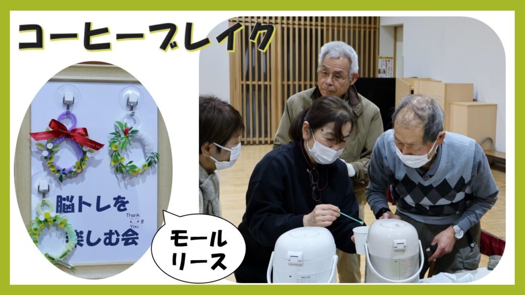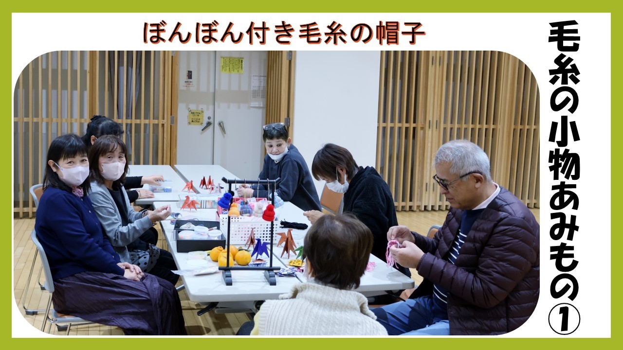 他の活動内容は、簡単な体操、脳トレクイズ(間違い探し、マッチ棒パズル、四角囲み、ナンプレ等)は、各自にプリントを配付しています。初めに間違い探しとマッチ棒パズルを参加者全員で解き、答え合わせをしました。その後、自由選択となりました。コーヒー、紅茶、お茶などで喉を潤した後は、三々五々集まり、初めて取り入れた、「モールリース作り」や「ボンボン付き毛糸の帽子編み物」それぞれが楽しんでいました。モールリース作りは、造花の配置をどのようにしようか迷いながらも完成した人、時間が足りなく家に持ち帰る人もいました。