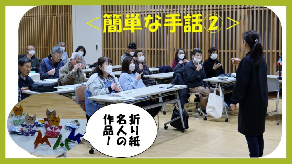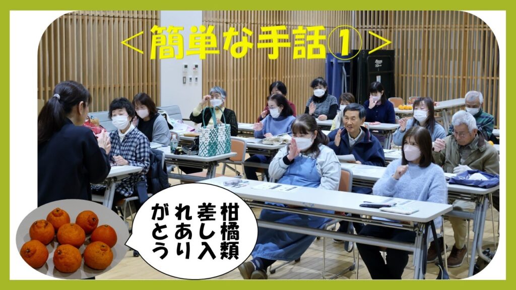 | 今回も、「やさしい手話」のコピーを配付して、丸山さんに教えて頂きました。あいさつの表現「ごめんなさい」・「よろしくお願いします」・「暑いですね」・「寒いですね」そして、五十音のヤ行~ワ行を「指文字」で表す方法を学びました。 | _ | ![]() |