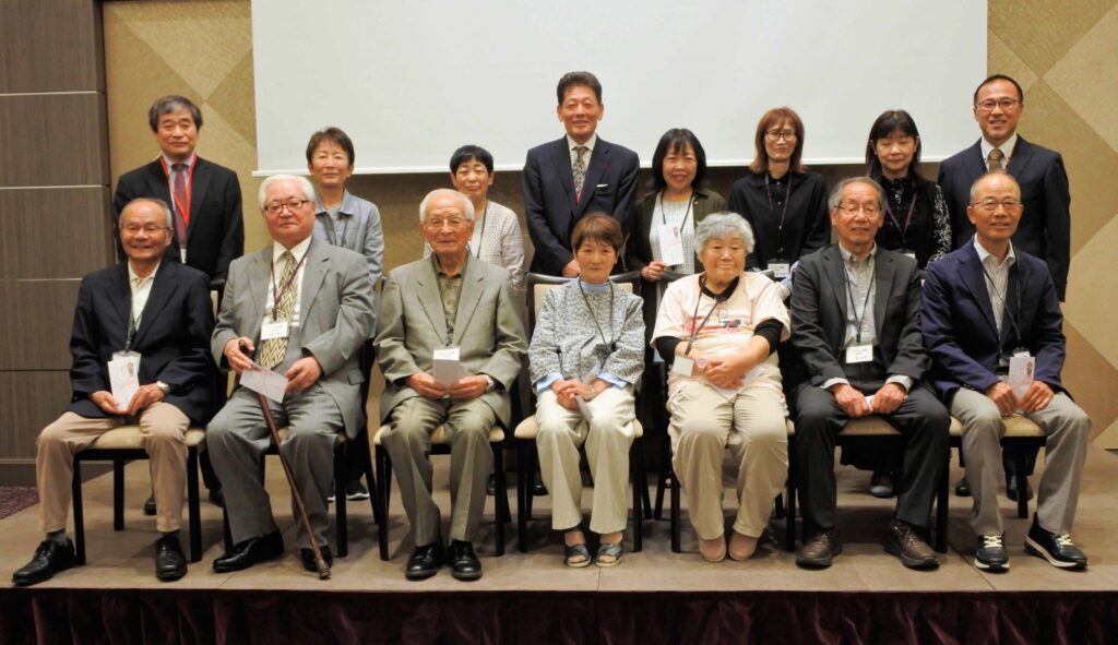 | 今年度の慶祝者は、米寿2名、喜寿20名、古希6名合計28名で、その内12名が出席され、記念品贈呈と記念撮影で総会は閉会となりました。 | ![]() |