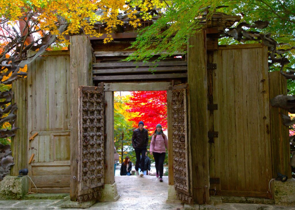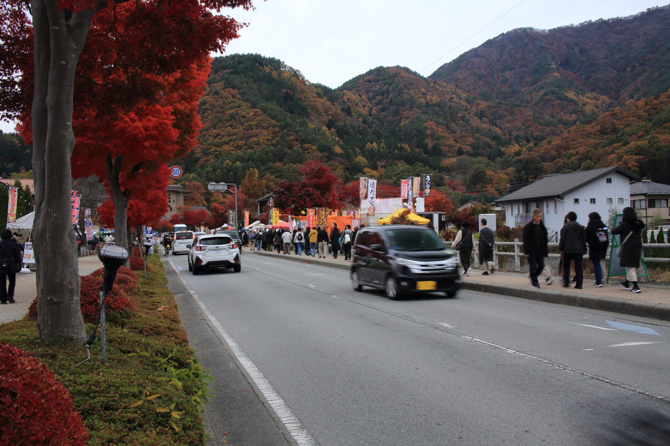 食事場所から、もみじ回廊まではバスで約20分。また平日なのに観光客の数が多いのに驚きました。殆どの人が海外からの観光客でした。もみじ回廊専用の駐車場からは、回廊まで約700m、