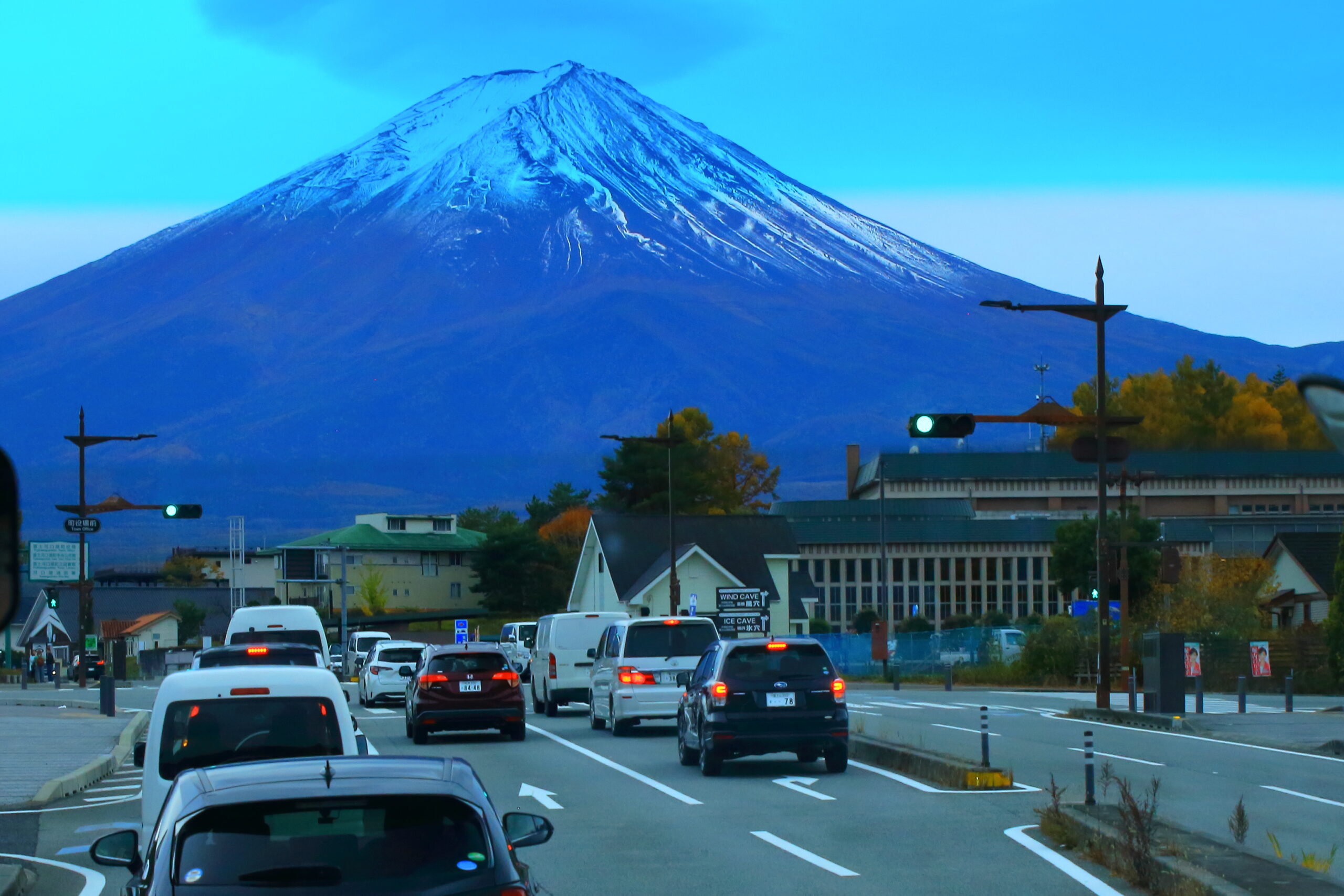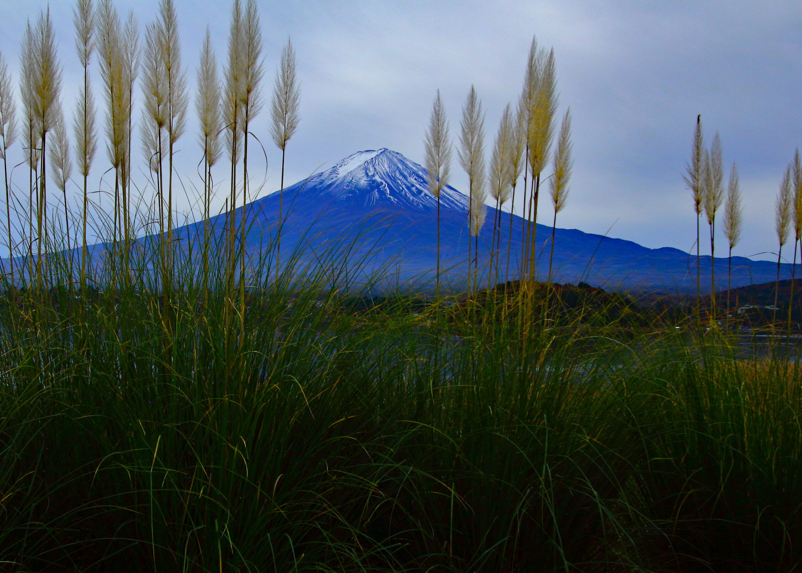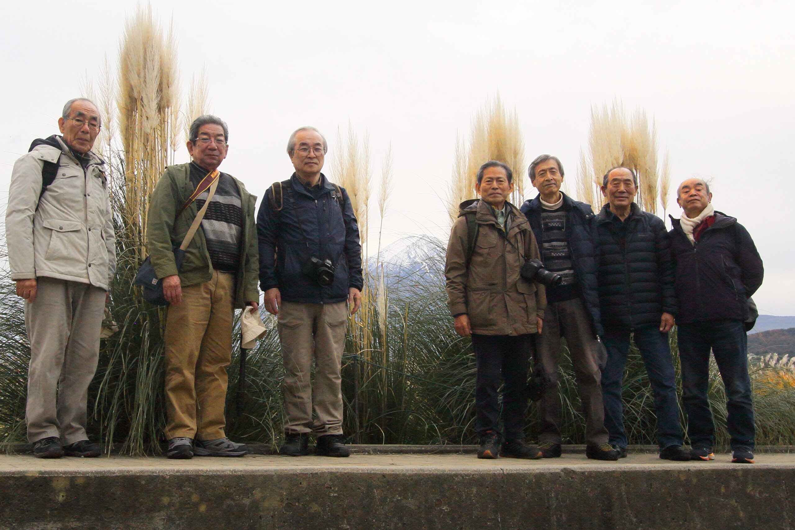 高速道路で山梨県に入る頃には、冠雪した雄大な富士が車窓に現れ、ホッとしたのと同時に、現地での富士山と紅葉とのコラボが楽しみになりました。早朝の道路は混雑も無く、10時過ぎには富士五湖周辺に入り、河口湖湖畔で集合写真を撮り、そして富士山~河口湖周辺の撮影を開始しました。