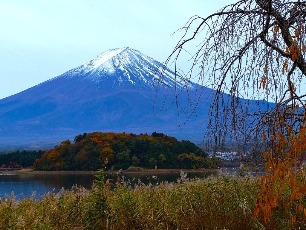 河口湖の目の前には冠雪した富士山と裾野が広がり、ふもとの紅葉もあり素晴らしい景色でした。