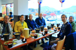 河口湖湖畔での昼食         もみじ回廊への車窓