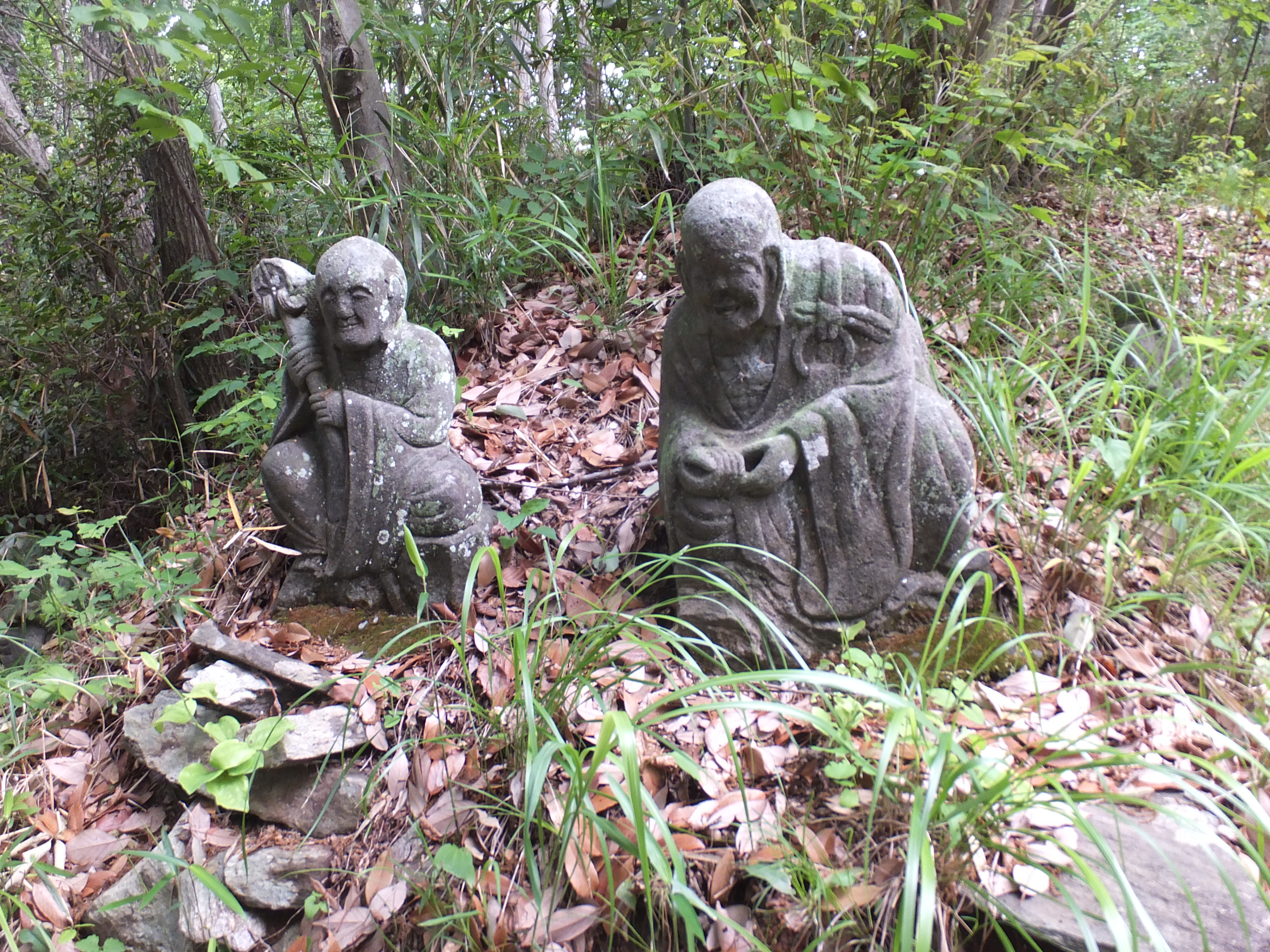 下ってからの再度の登りは少しキツいが山頂から下りの山道沿いの五百羅漢の石仏群が印象的な