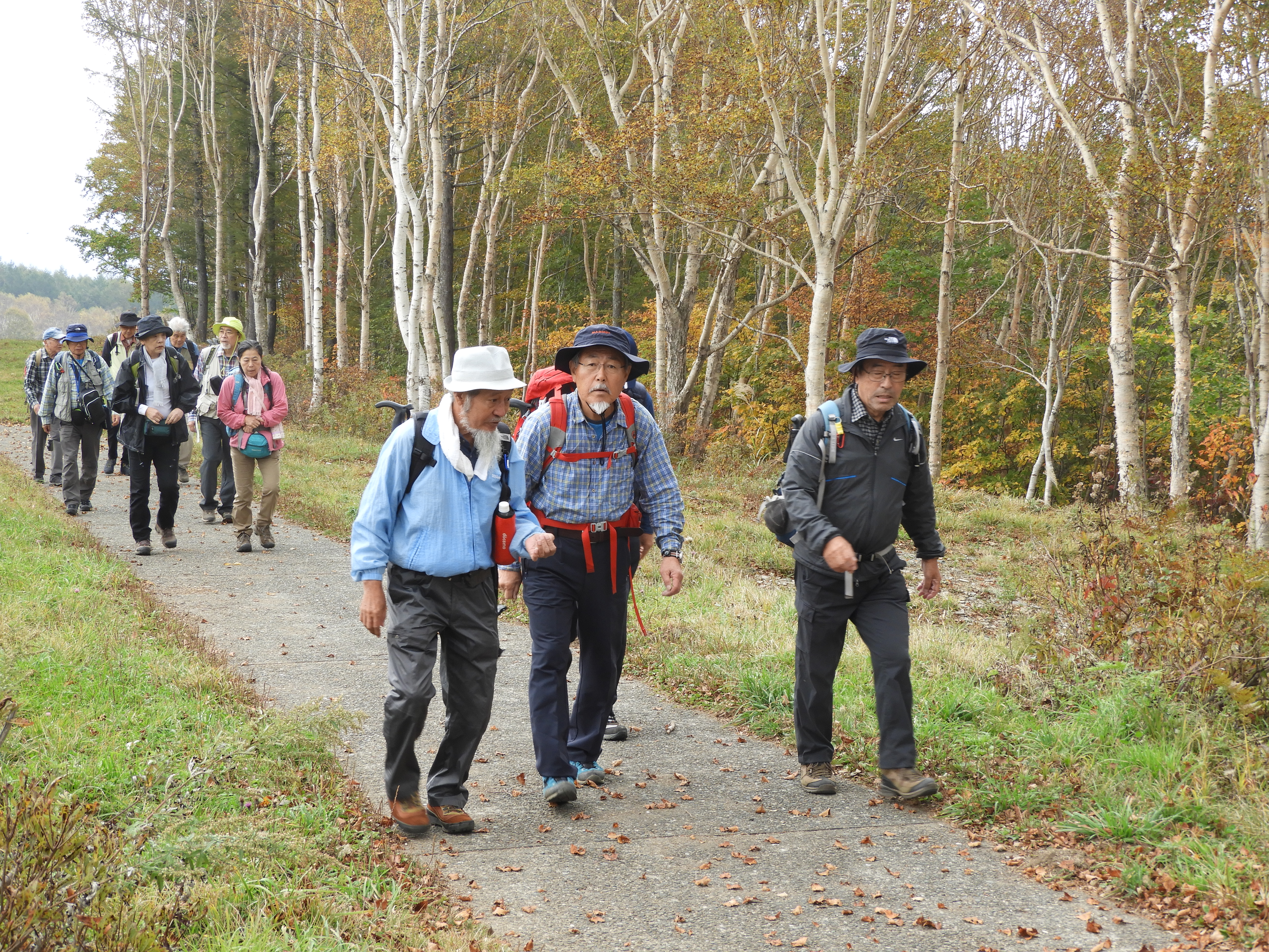 「武尊牧場キャンプ場」から、紅葉のブナ林トレイル4kmに全員がチャレンジする。