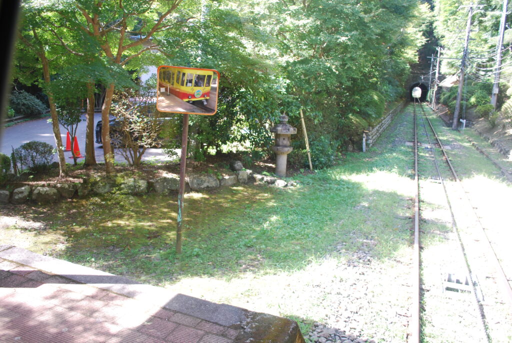 《清滝駅から高尾山駅への登りのミラー、ケーブルカーが写る》