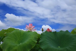 10時に入口付近に集合を約束して、各自、思い思いの撮影場所に向かいます。行田蓮(古代蓮)は原始的な形態を持つ1400~3000年前のものと推定されていて、行田市の天然記念物に指定されています。地中深く眠っていた蓮の実が出土し、自然発芽して開花した事は極めて珍しいと言われ午前中にピンクの大輪の花を咲かせます。8時頃は、少し曇っていた空が、集合時間の10時頃には真っ青の空に白い雲、絶好の蓮の花の撮影雰囲気になりました。青空を横目に、とりあえず全員で集合写真を撮り、その後も蓮の撮影を続けました。